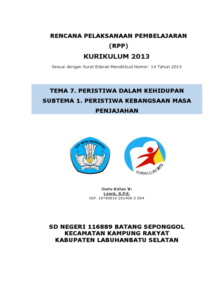 Rpp kelas 5 tema 7 subtema 1 peristiwa kebangsaan masa penjajahan (unduh).